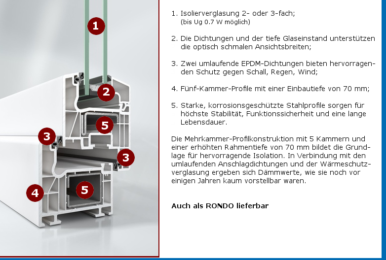 Die Mehrkammer-Profilkonstruktion mit fünf Kammern und einer erhöhten Rahmentiefe von 70 mm bildet die Grundlage für hervorragende Isolation.In Verbindung mit den umlaufenden Anschlagdichtungen und der Wärmeschutzverglasung ergeben sich Dämmwerte, wie sie noch vor einigen Jahren kaum vorstellbar waren.